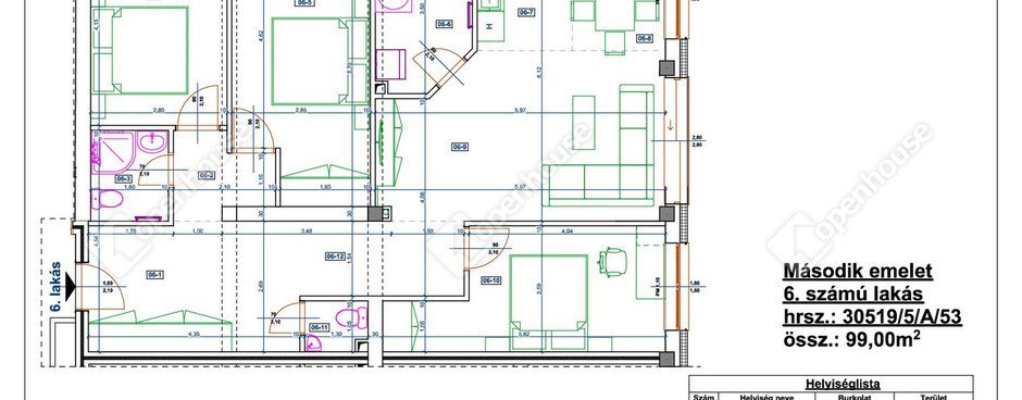 | Azonosító | Ingatlan típusa | Emelet | Lakótér (m2) | Szobák száma | Ebből hálószobák száma | Ár (Ft) | Státusz | ||||||||